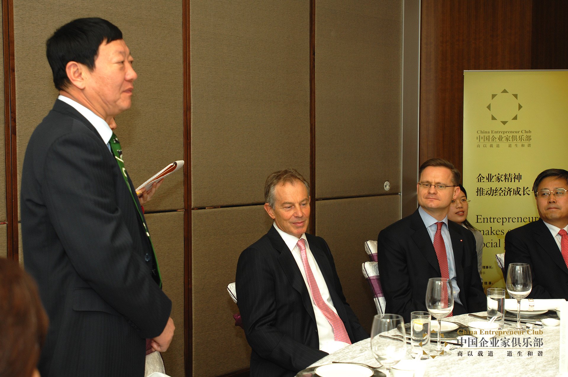 2008年3月19日,中國企業(yè)家俱樂部在北京麗晶酒店設(shè)宴,邀請英國前首相托尼.布萊爾先生共進午餐,就全球氣候變化及低碳經(jīng)濟的發(fā)展進行交流。牛根生、張醒生、馮軍、王偉斌、艾欣等俱樂部成員以及中國建設(shè)銀行行長郭樹清、北京銀行董事長閻冰竹、匯豐銀行遠大空調(diào)董事長張躍等企業(yè)家參加了午宴。