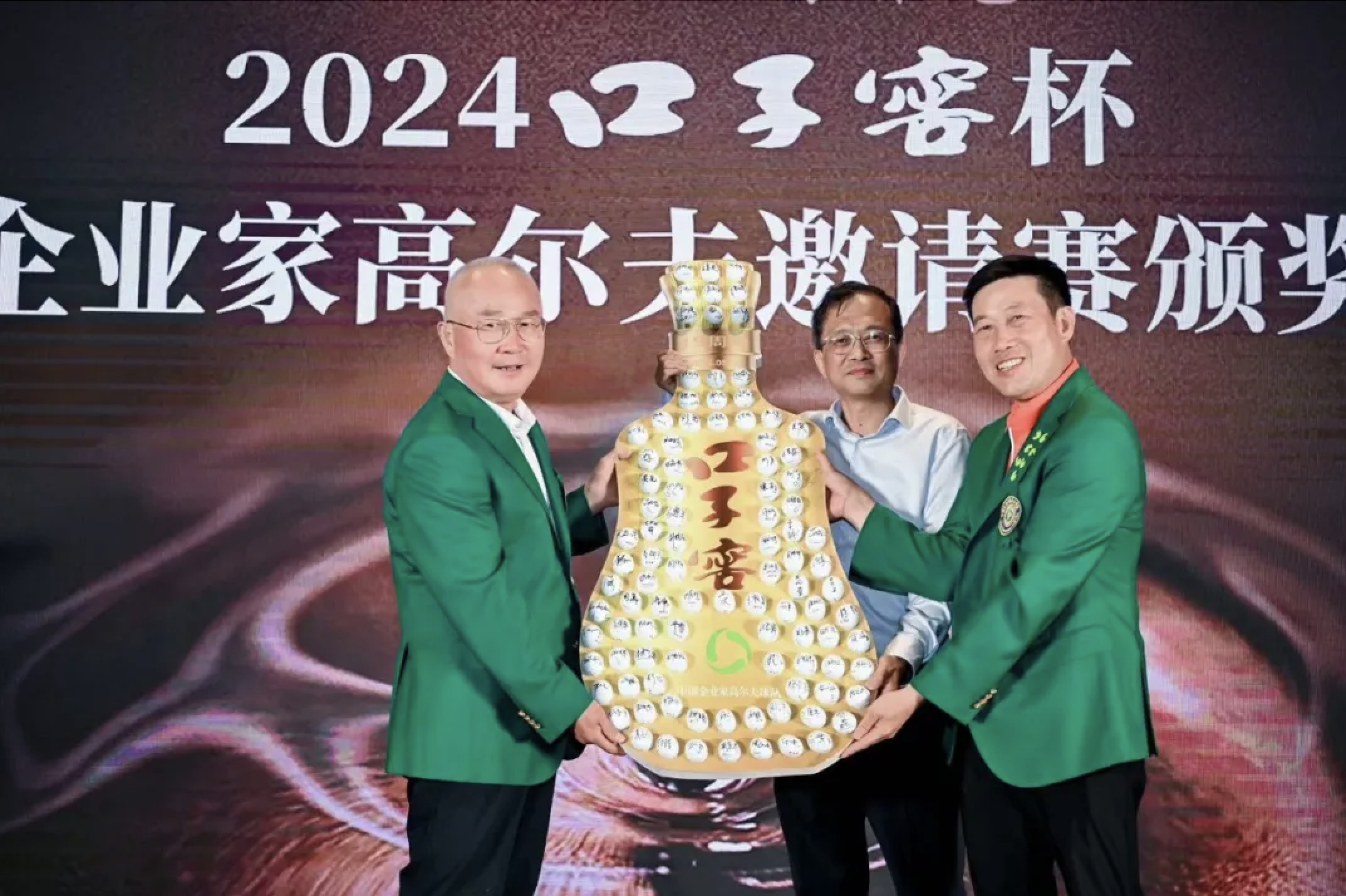 中國企業家高爾夫球隊隊長、浙江省高爾夫球協會主席俞春雷與安徽省企業家聯合會副會長兼秘書長邢志昂向安徽口子酒業股份有限公司董事長、安徽省高爾夫球運動協會主席徐進贈送參賽隊員簽名的高爾夫球紀念板。