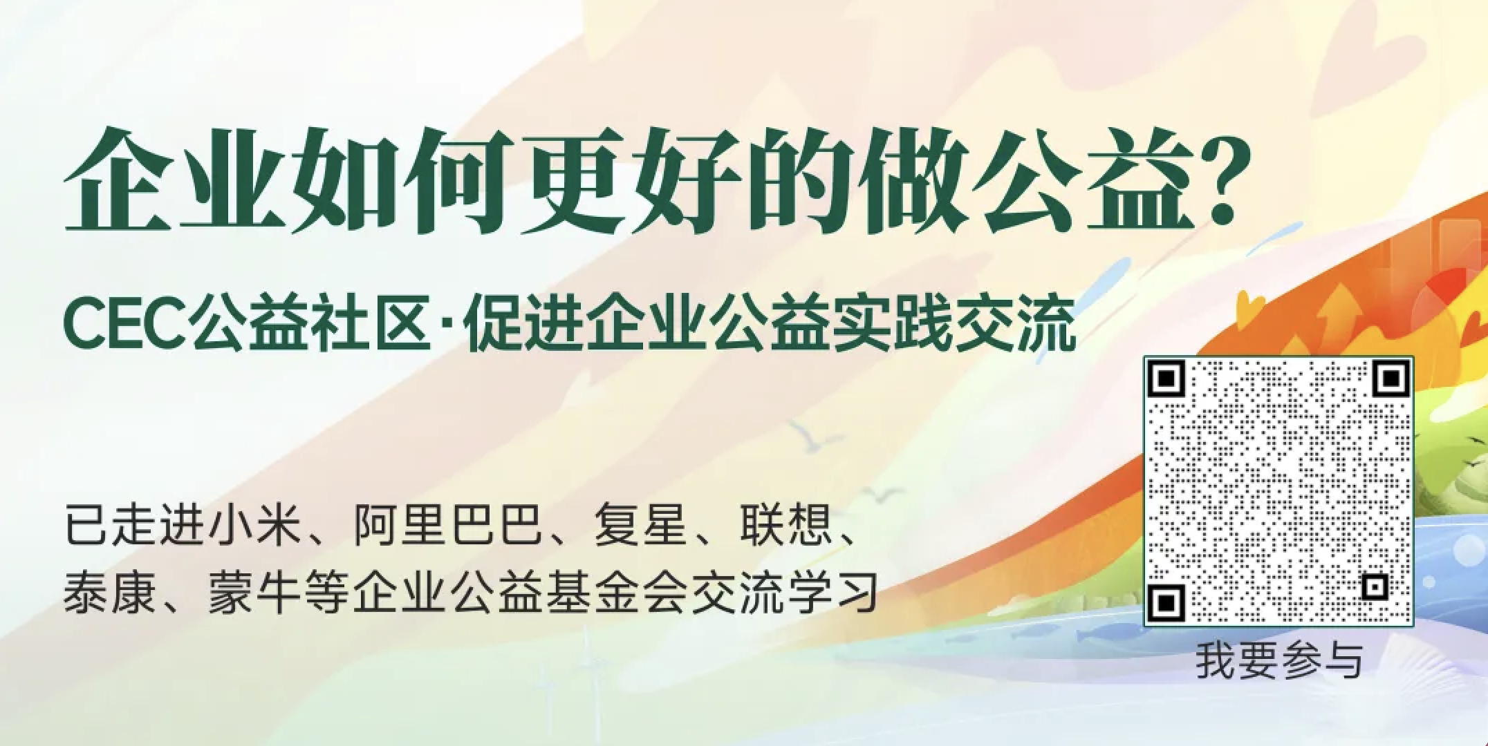 CEC公益社區(qū)是由企業(yè)綠色發(fā)展研究院和中國(guó)企業(yè)家俱樂(lè)部搭建的學(xué)習(xí)平臺(tái),致力于促進(jìn)企業(yè)間公益實(shí)踐的共享、經(jīng)驗(yàn)交流和共同創(chuàng)新公益的方法,已走進(jìn)小米、阿里巴巴、復(fù)星、聯(lián)想、泰康、蒙牛等企業(yè)基金會(huì)。