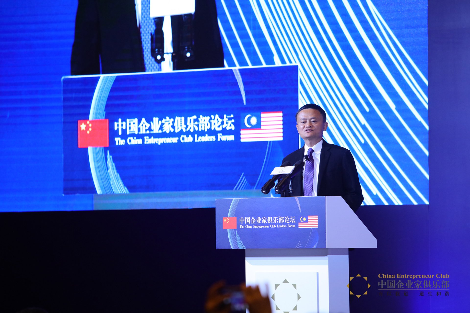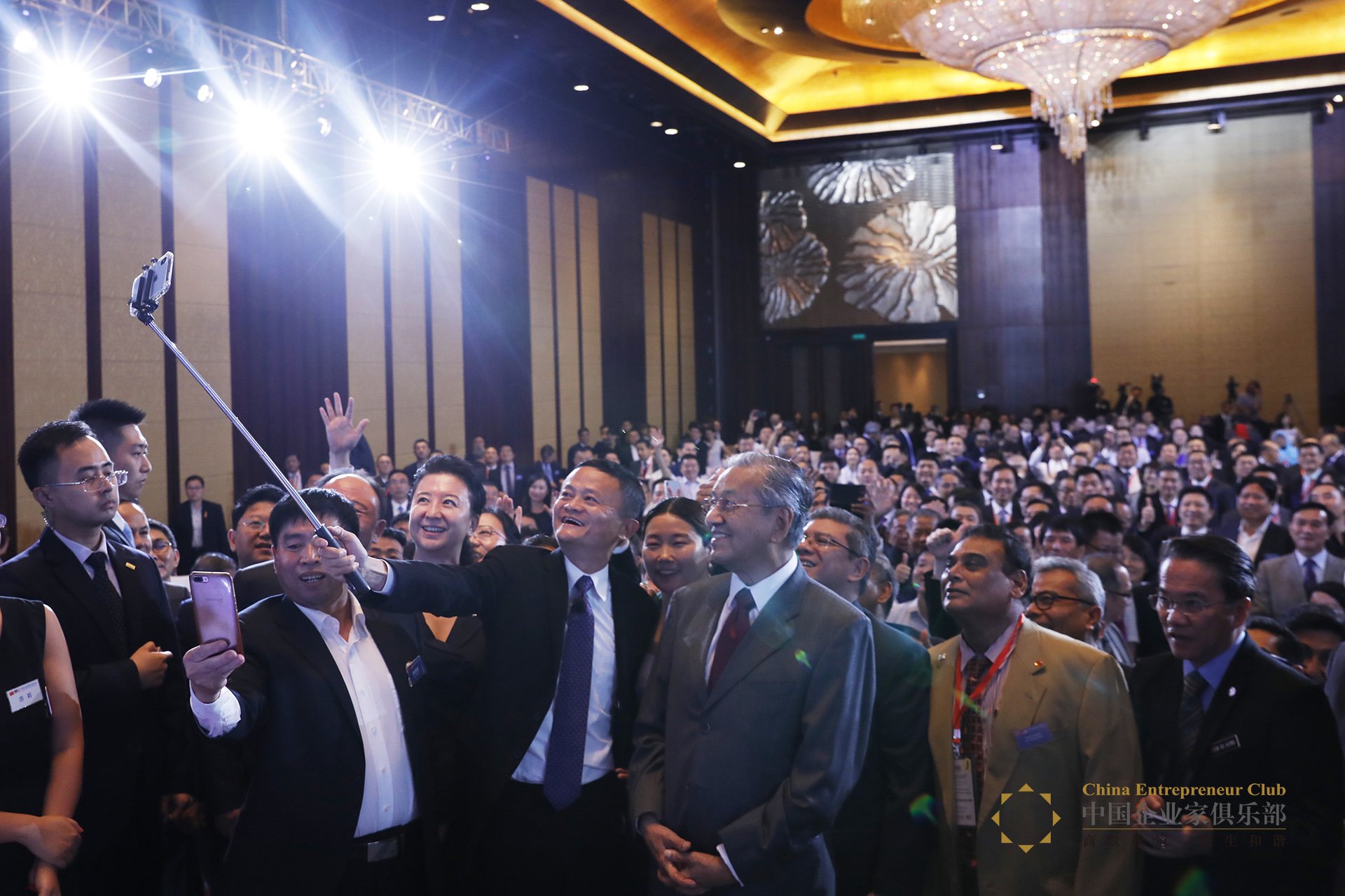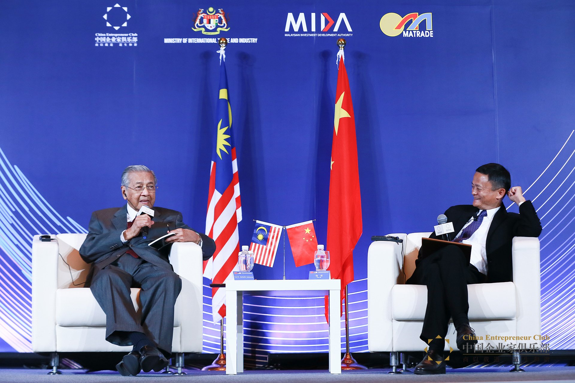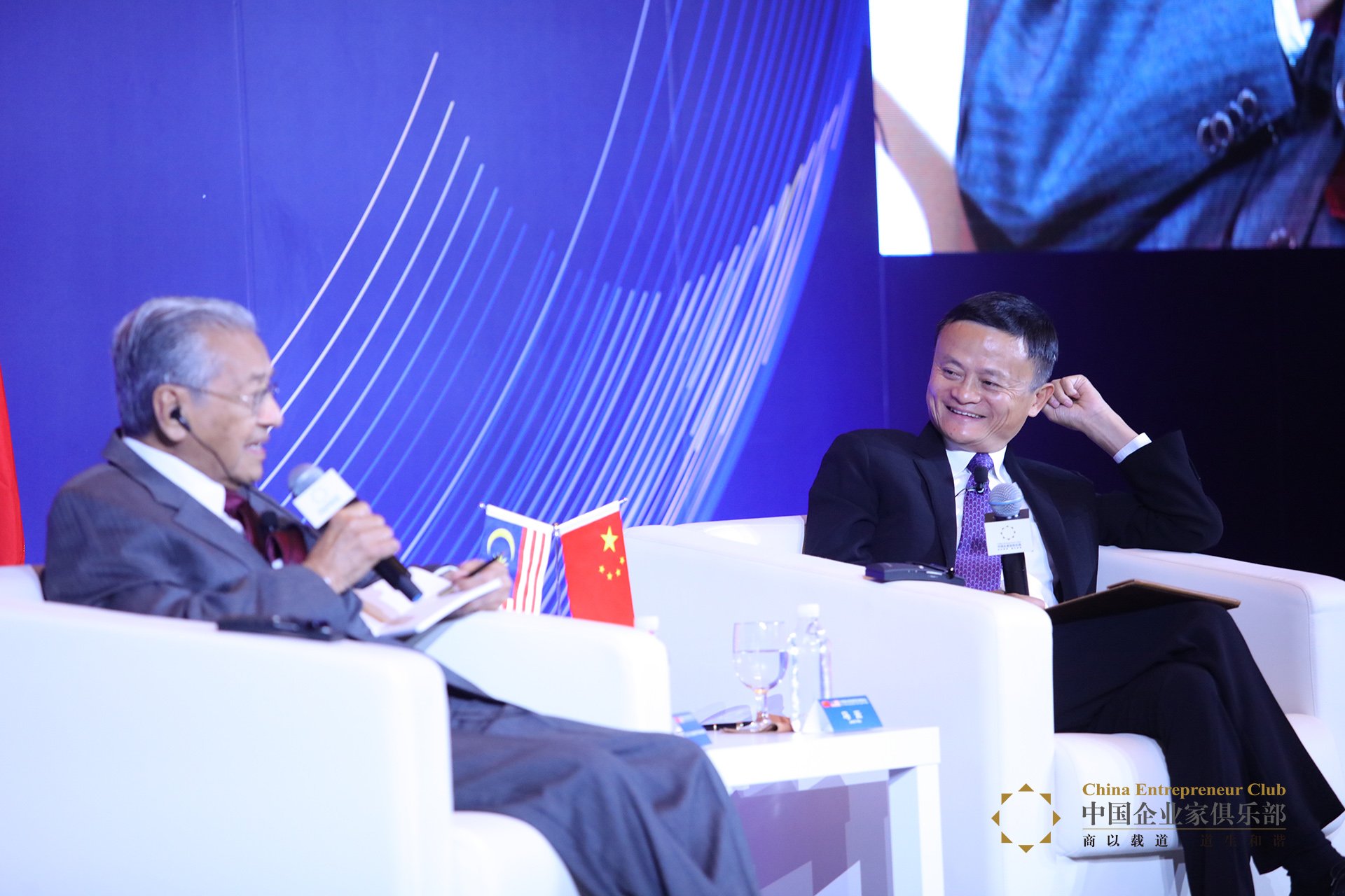 中國企業家俱樂部論壇迎來了馬來西亞總理馬哈蒂爾,中國企業家俱樂部主席馬云主持了論壇。