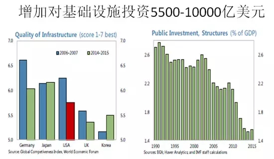 比如說基礎(chǔ)設(shè)施,大家可以看到危機以前藍的美國,危機以后美國基礎(chǔ)設(shè)施急劇下跌,美國的火車特別慢,紐約到華盛頓走三個小時,我昨天從北京到這兒高鐵兩個小時就夠了。美國國內(nèi)對基礎(chǔ)設(shè)施的投資從三十年前的占GDP的2.8%,跌到今天的1.4% ,導(dǎo)致了基礎(chǔ)設(shè)施老化下降,所以確實對基礎(chǔ)設(shè)施投資有需求。