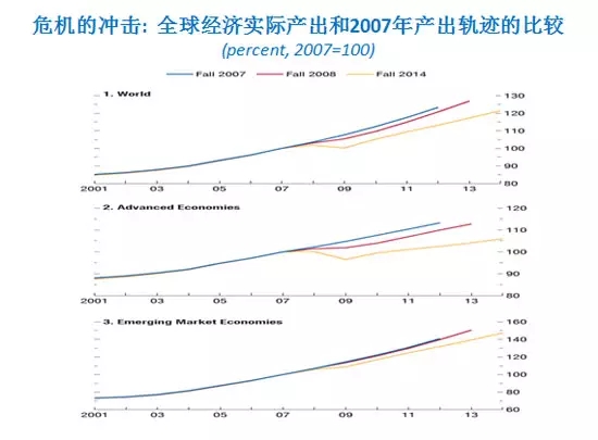 2010年全世界金融危機以后,全球經(jīng)濟增長的速度一直緩緩的下降,今年到了3.3%左右,但是仍然處于低位,為什么全球增長會處于低迷狀態(tài),這是因為全球金融危機沖擊的影響遠遠超過我們的想象。這個藍的線是07年全球GDP的,紅的是我們做的調(diào)整的預(yù)測,黃的是實際的結(jié)果,危機是把全球經(jīng)濟的GDP水平平行的下壓到了一個低的水平。這個缺口就是我們世界永久性損失掉的因為危機產(chǎn)生的缺口,1929年以來全球危機以來,反彈超過以前的軌道,第一次經(jīng)濟的水平遠遠低于原有的柜機,增長能力也在下降,我們做了預(yù)測,全球經(jīng)濟的潛在基礎(chǔ)生產(chǎn)能力藍的增長能力,紅的勞動的增長能力,投資在下降,老齡化勞動力,增長速度在下降,所以未來五年潛在的勞動經(jīng)濟增長速度也在下降,所以危機的影響是在靜態(tài)的經(jīng)濟水平壓低了,把增長的勢頭給減慢了,這是我們今天面臨的一個大的基本的結(jié)構(gòu),我們處在一個低的增長水平,低貿(mào)易增長,低油價,低利率,低通脹。這個是我們今天面臨的全球的一個大的基本格局。