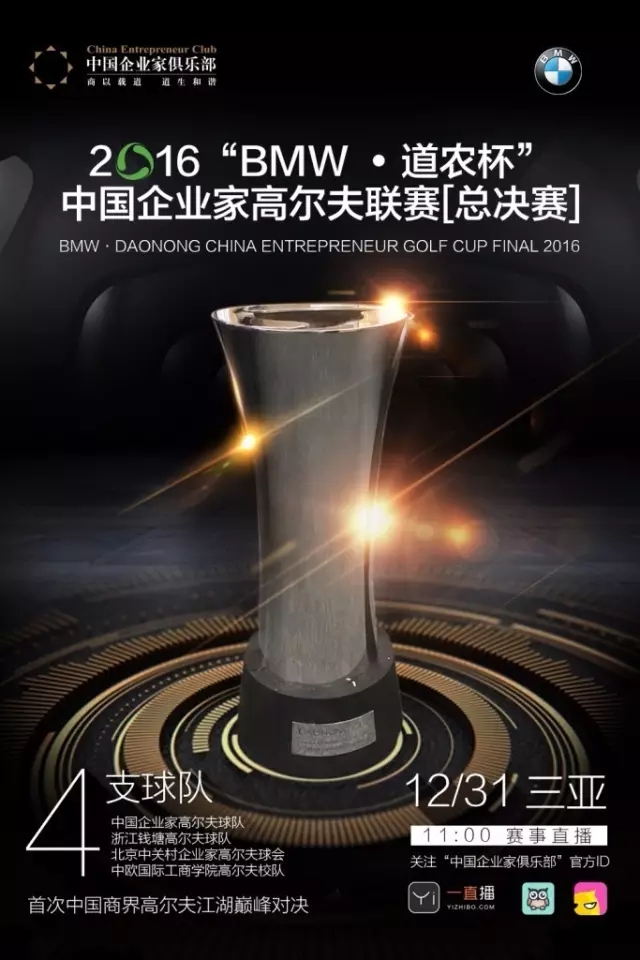 12月31日,由中國企業家俱樂部主辦的2016“BMW•道農杯”中國企業家高爾夫聯賽總決賽將在三亞鹿回頭高爾夫球會正式開戰。這是第一次全國性的商界高爾夫江湖巔峰對決。屆時群英聚首,揮桿論劍,爭霸高球之巔!