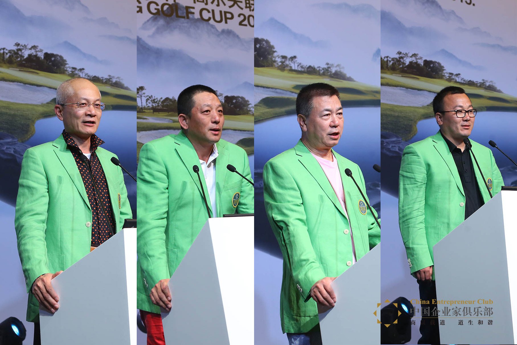 左至右,成雁、邱蕾榮、蘇治昌、劉恕、李振偉、王禮賢、張醒生,身著 “綠西裝”正式成為中國企業家高爾夫球隊終身隊員。