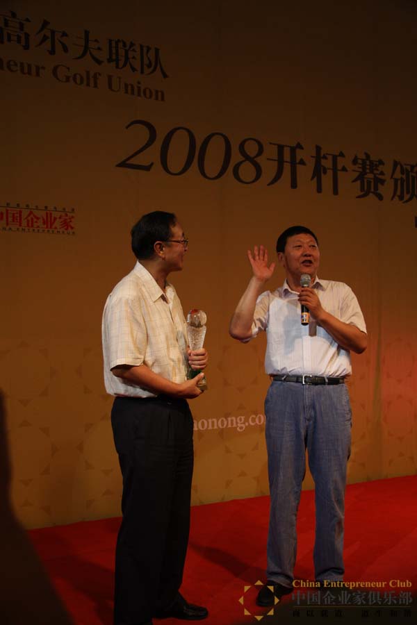 賽后的頒獎午宴上,高朋滿座。賽事主辦方將“領袖獎”頒給了柳傳志先生,以感謝其對俱樂部活動的大力支持。頒獎人牛根生先生感慨道:“在中國可以給柳傳志總裁頒獎的人好像不太多,我今天非常榮幸,比領獎人還要榮幸。我獲得2003年度經(jīng)濟人物,發(fā)獎人正是柳總。”