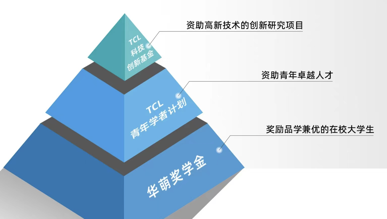 TCL公益基金會(huì)設(shè)立“TCL高校捐贈(zèng)體系”,以“TCL科技創(chuàng)新基金”、“TCL青年學(xué)者計(jì)劃”、“華萌獎(jiǎng)學(xué)金”三大項(xiàng)目,聚焦科技創(chuàng)新激勵(lì)、青年學(xué)者支持和優(yōu)秀學(xué)生資助。截至2023年底,“TCL高校捐贈(zèng)體系”已在華南理工大學(xué)、南開大學(xué)、四川大學(xué)、電子科技大學(xué)、西北工業(yè)大學(xué)、西安電子科技大學(xué)、哈爾濱工業(yè)大學(xué)落成,累計(jì)投入1930萬元,資助科研項(xiàng)目14項(xiàng),青年學(xué)者8人,學(xué)生238人。