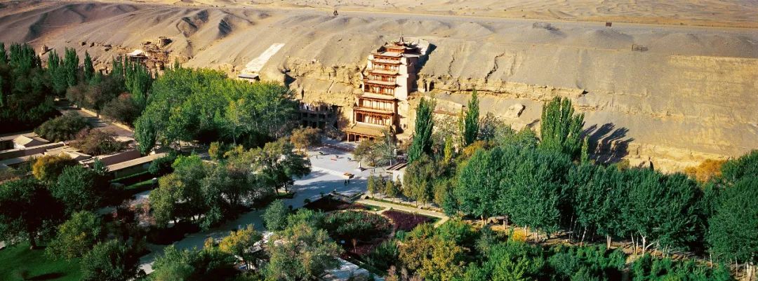 ▲莫高窟俗稱千佛洞,在敦煌城東南鳴沙山東麓,前臨宕泉河,東向三危山。據說前秦時,僧人樂尊行至此處,忽見金光,狀有千佛,遂開窟造像,自此直至元代,營造不斷。